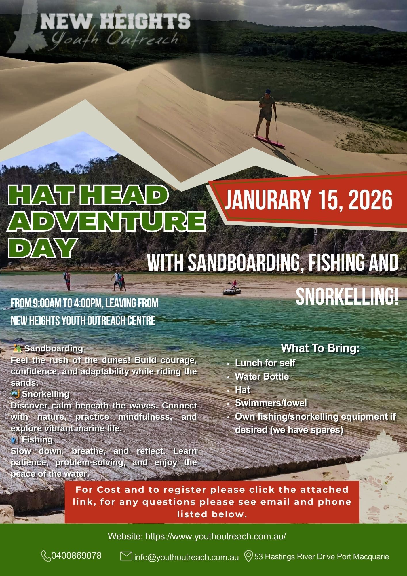 Sand boarding, fishing, snorkelling at Hat Head on the 15th of January!